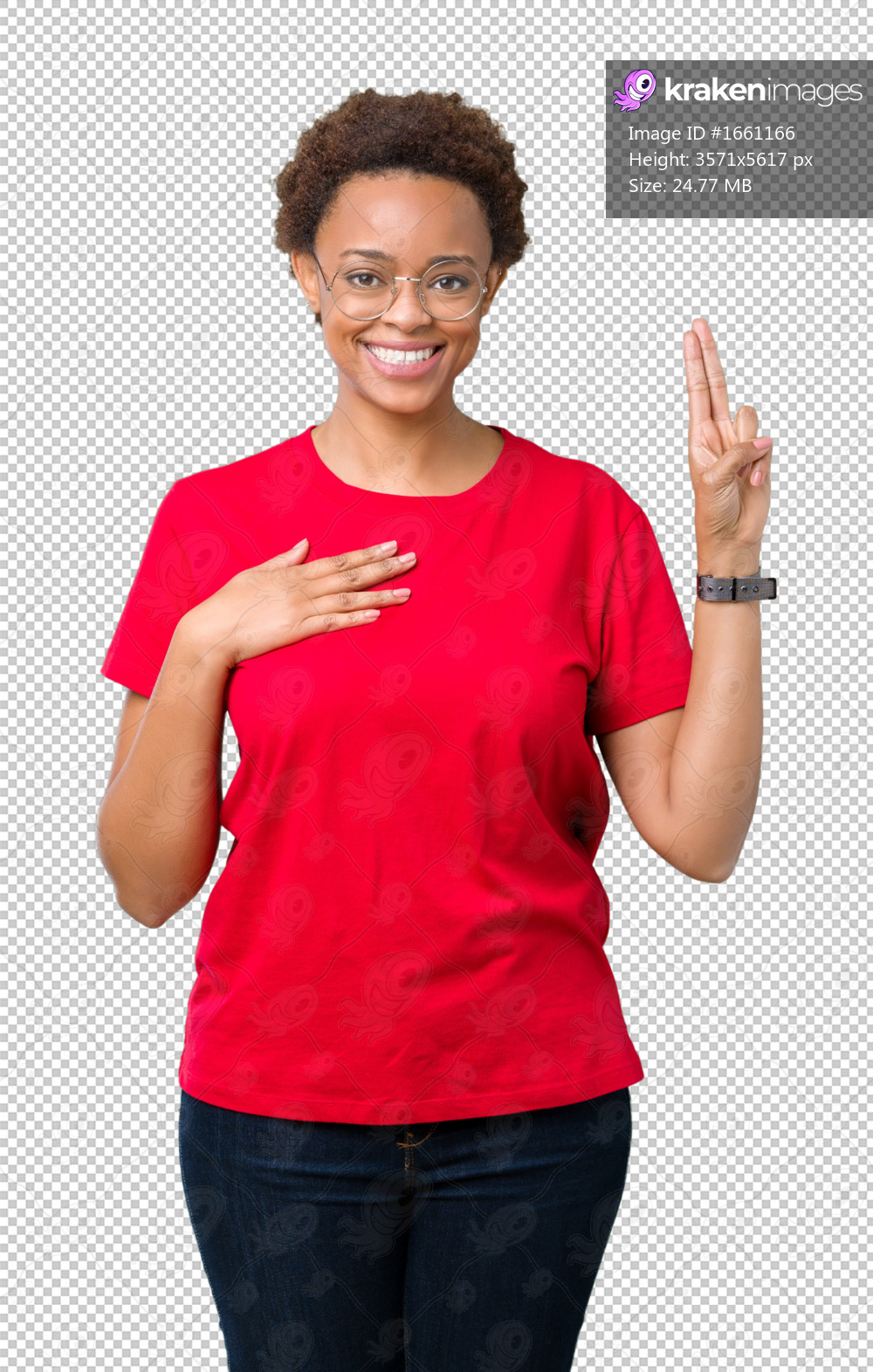 Beautiful young african american woman wearing glasses over isolated background Swearing with hand on chest and fingers, making a loyalty promise oath