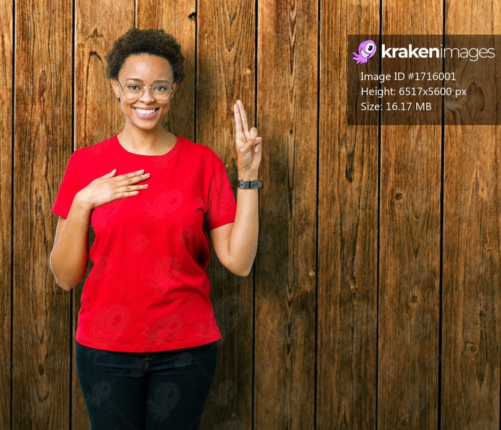 Beautiful young african american woman wearing glasses over isolated background Swearing with hand on chest and fingers, making a loyalty promise oath