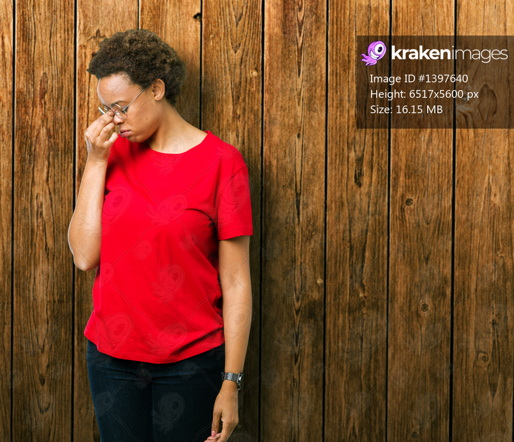 Beautiful young african american woman wearing glasses over isolated background tired rubbing nose and eyes feeling fatigue and headache. Stress and frustration concept. - Kraken Images