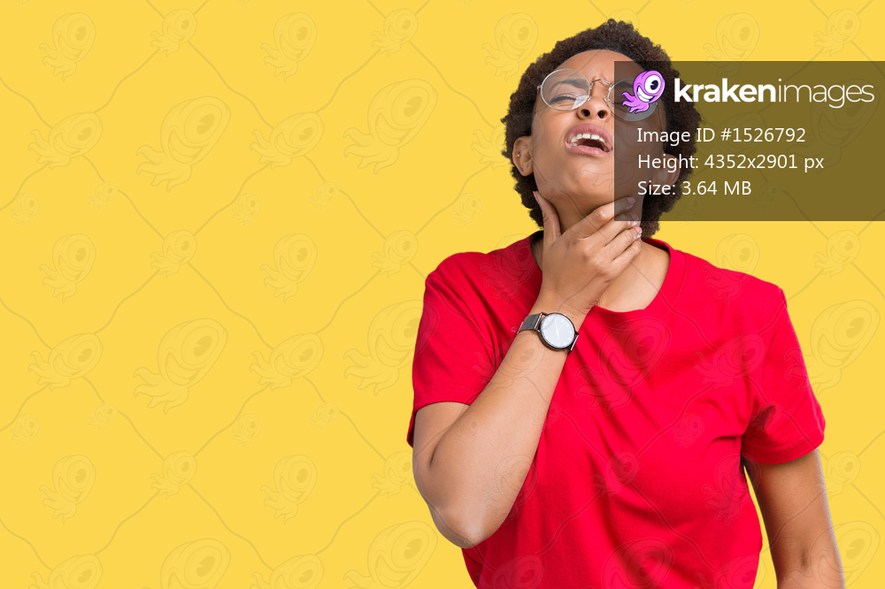 Beautiful young african american woman wearing glasses over isolated background Touching painful neck, sore throat for flu, clod and infection