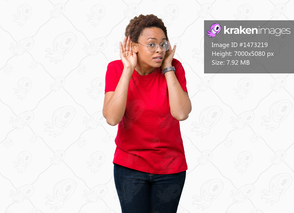 Beautiful young african american woman wearing glasses over isolated background Trying to hear both hands on ear gesture, curious for gossip. Hearing problem, deaf - Kraken Images