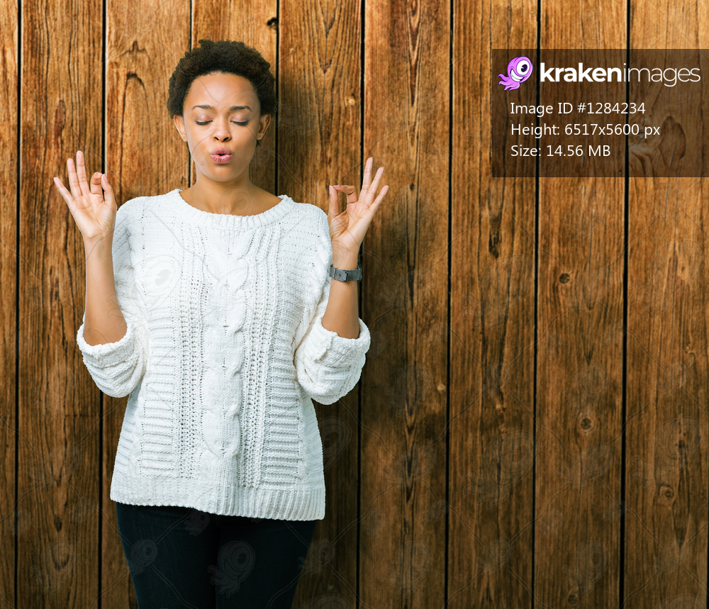 Beautiful young african american woman wearing sweater over isolated background relax and smiling with eyes closed doing meditation gesture with fingers. Yoga concept. - Kraken Images