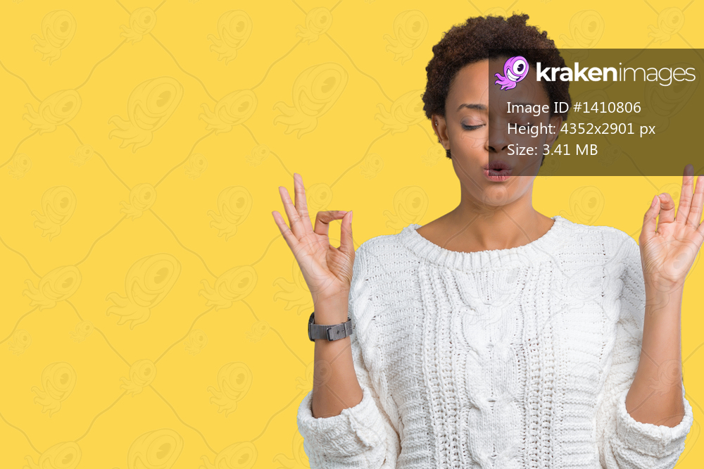 Beautiful young african american woman wearing sweater over isolated background relax and smiling with eyes closed doing meditation gesture with fingers. Yoga concept. - Kraken Images