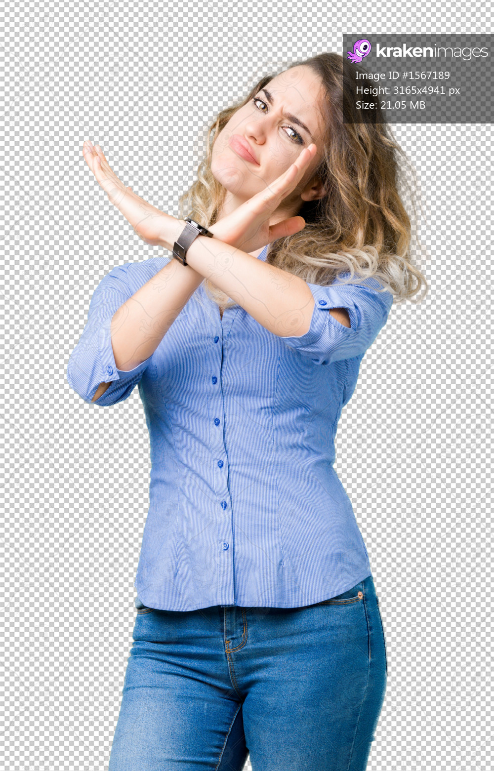 Beautiful young blonde business woman over isolated background Rejection expression crossing arms doing negative sign, angry face
