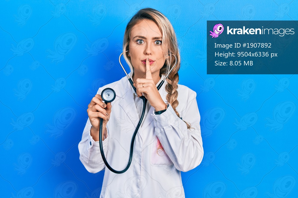 Beautiful young blonde doctor woman holding stethoscope asking to be quiet with finger on lips. silence and secret concept.