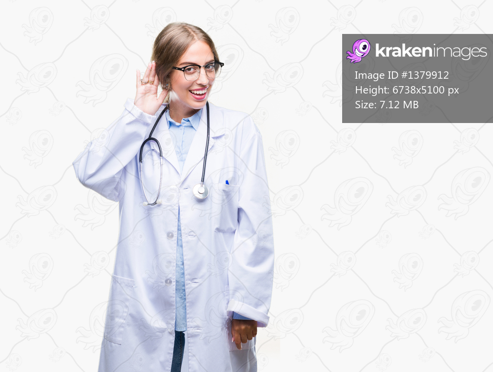 Beautiful young blonde doctor woman wearing medical uniform over isolated background smiling with hand over ear listening an hearing to rumor or gossip. Deafness concept. - Kraken Images
