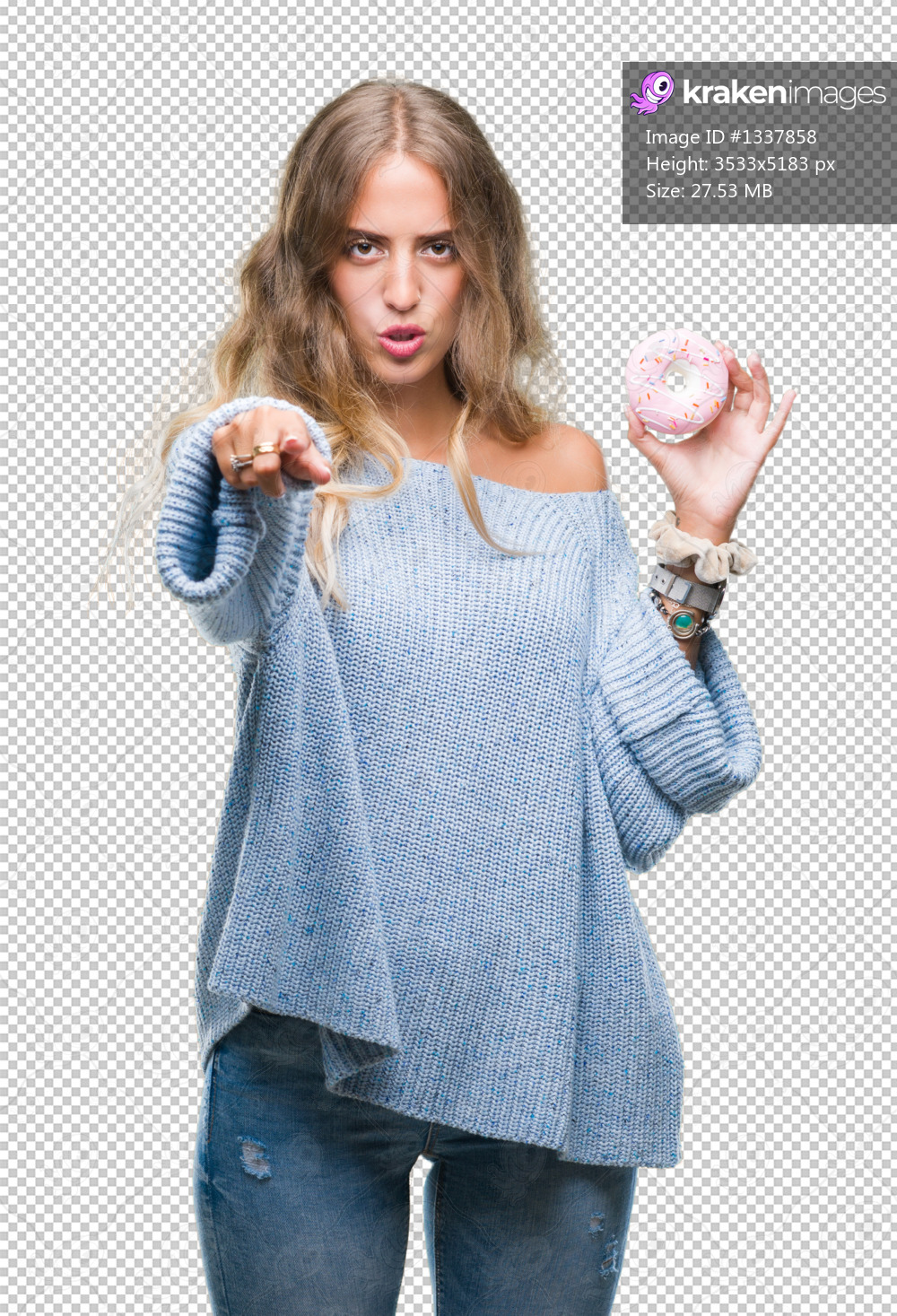 Beautiful young blonde woman eating pink donut over isolated background pointing with finger to the camera and to you, hand sign, positive and confident gesture from the front - Kraken Images