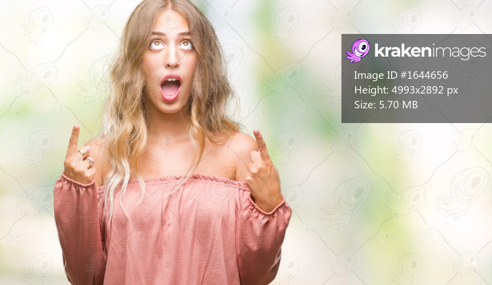 Beautiful young blonde woman over isolated background amazed and surprised looking up and pointing with fingers and raised arms.