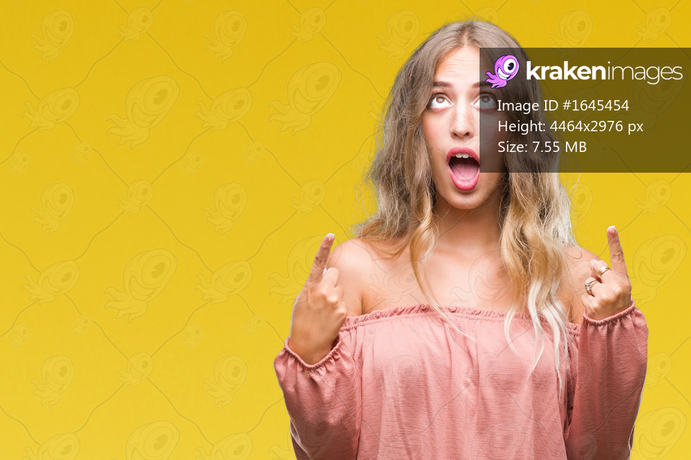 Beautiful young blonde woman over isolated background amazed and surprised looking up and pointing with fingers and raised arms.