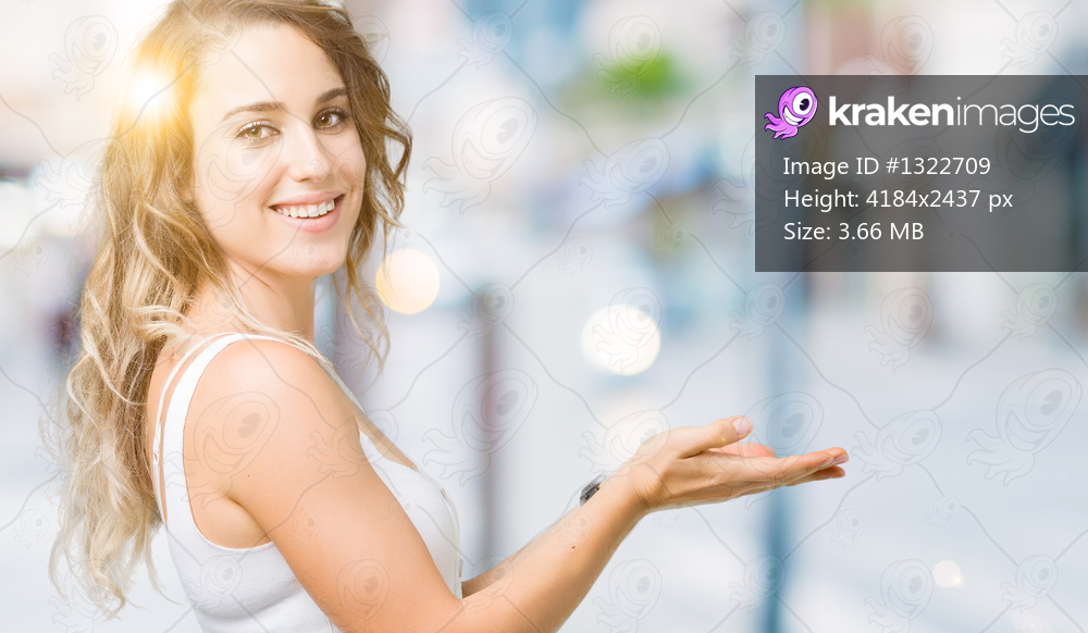 Beautiful young blonde woman over isolated background Pointing to the side with hand and open palm, presenting ad smiling happy and confident