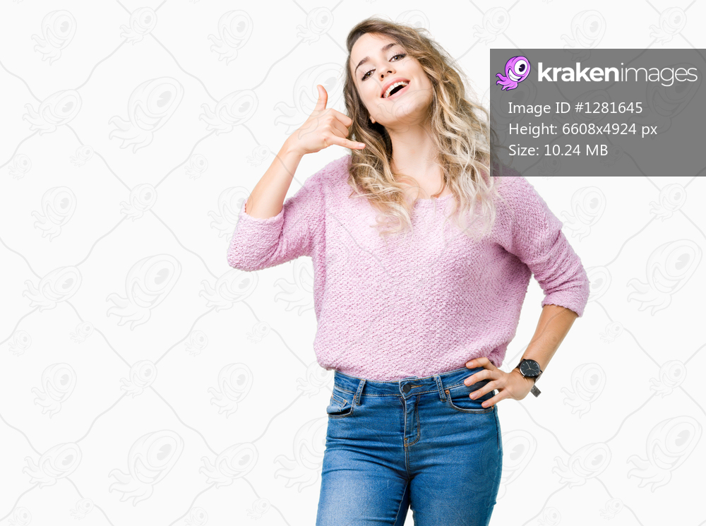 Beautiful young blonde woman over isolated background smiling doing phone gesture with hand and fingers like talking on the telephone. Communicating concepts. - Kraken Images