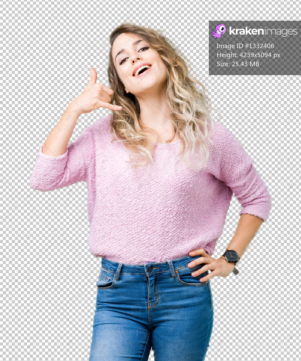 Beautiful young blonde woman over isolated background smiling doing phone gesture with hand and fingers like talking on the telephone. Communicating concepts. - Kraken Images