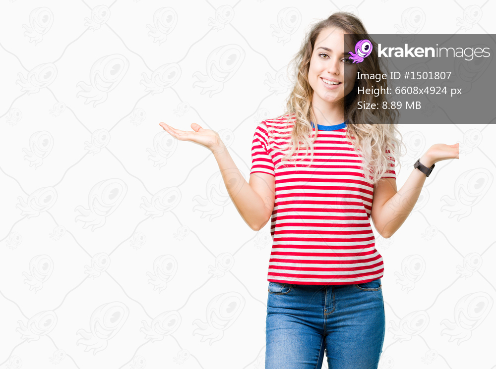 Beautiful young blonde woman over isolated background Smiling showing both hands open palms, presenting and advertising comparison and balance