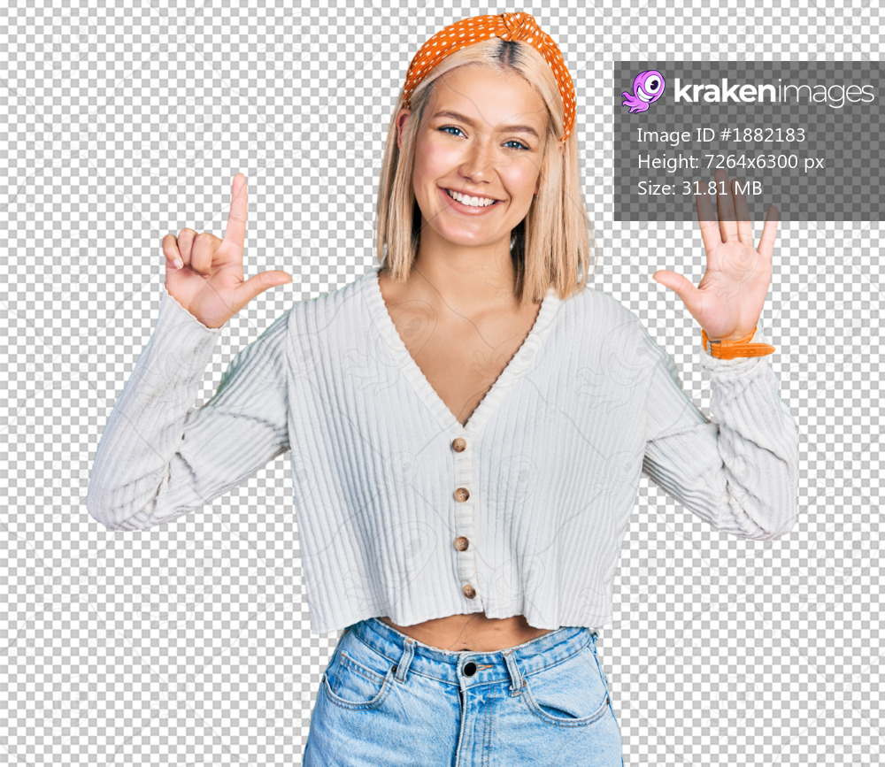 Beautiful young blonde woman wearing casual white sweater showing and pointing up with fingers number seven while smiling confident and happy.