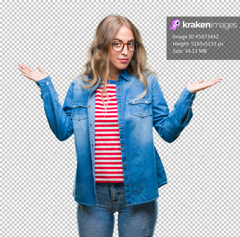 Beautiful young blonde woman wearing glasses over isolated background clueless and confused expression with arms and hands raised. Doubt concept.
