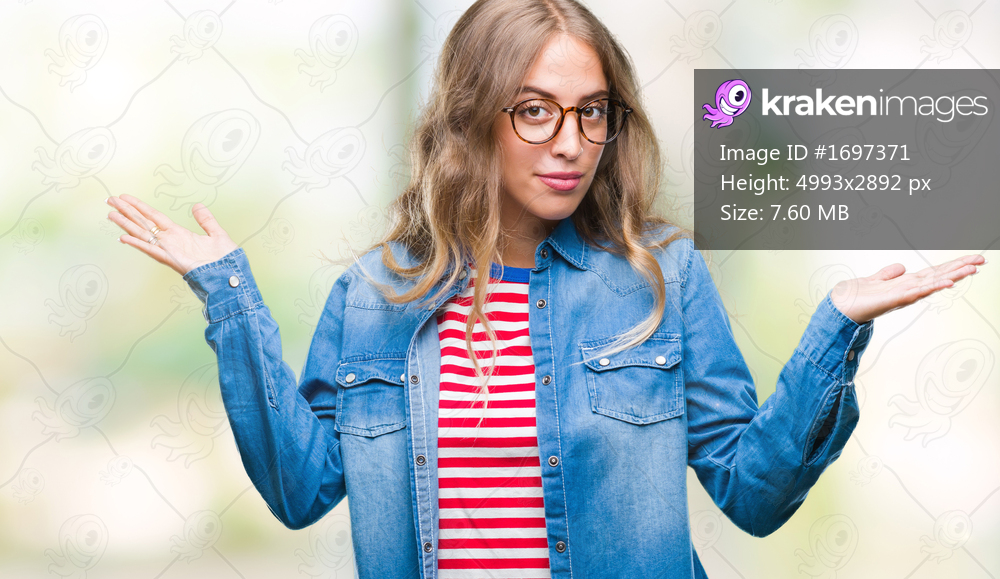 Beautiful young blonde woman wearing glasses over isolated background clueless and confused expression with arms and hands raised. Doubt concept.
