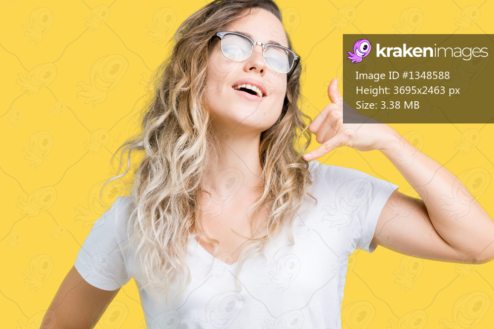 Beautiful young blonde woman wearing glasses over isolated background smiling doing phone gesture with hand and fingers like talking on the telephone. Communicating concepts. - Kraken Images