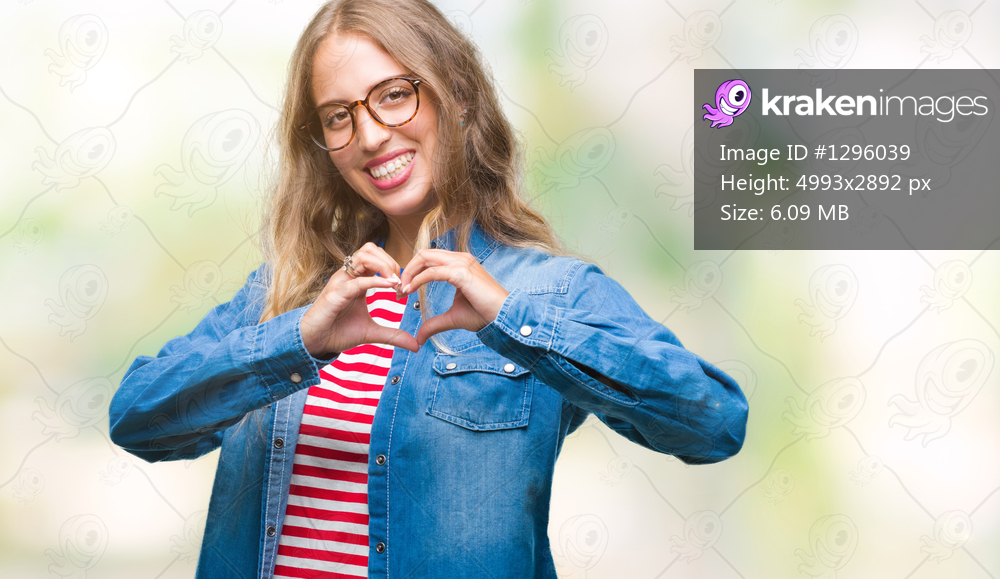 Beautiful young blonde woman wearing glasses over isolated background smiling in love showing heart symbol and shape with hands. Romantic concept.