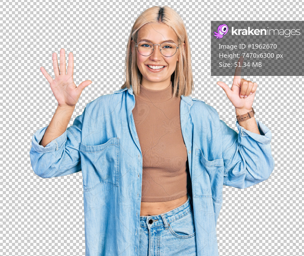 Beautiful young blonde woman wearing glasses showing and pointing up with fingers number seven while smiling confident and happy.