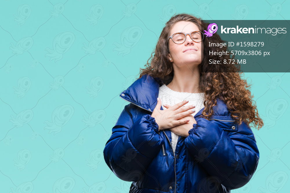 Beautiful young brunette curly hair girl wearing winter coat, glasses and sweater over isolated background smiling with hands on chest with closed eyes and grateful gesture on face. Health concept. - Kraken Images