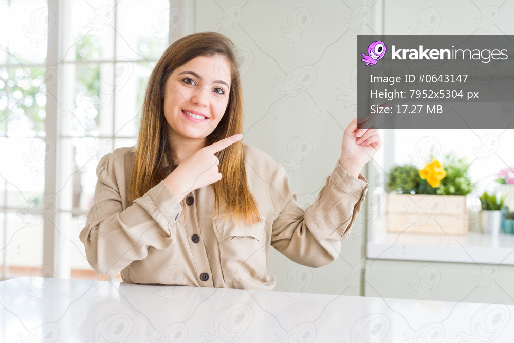 Beautiful young woman at home smiling and looking at the camera pointing with two hands and fingers to the side.