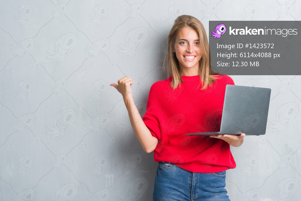 Beautiful young woman over grunge grey wall using computer laptop pointing and showing with thumb up to the side with happy face smiling