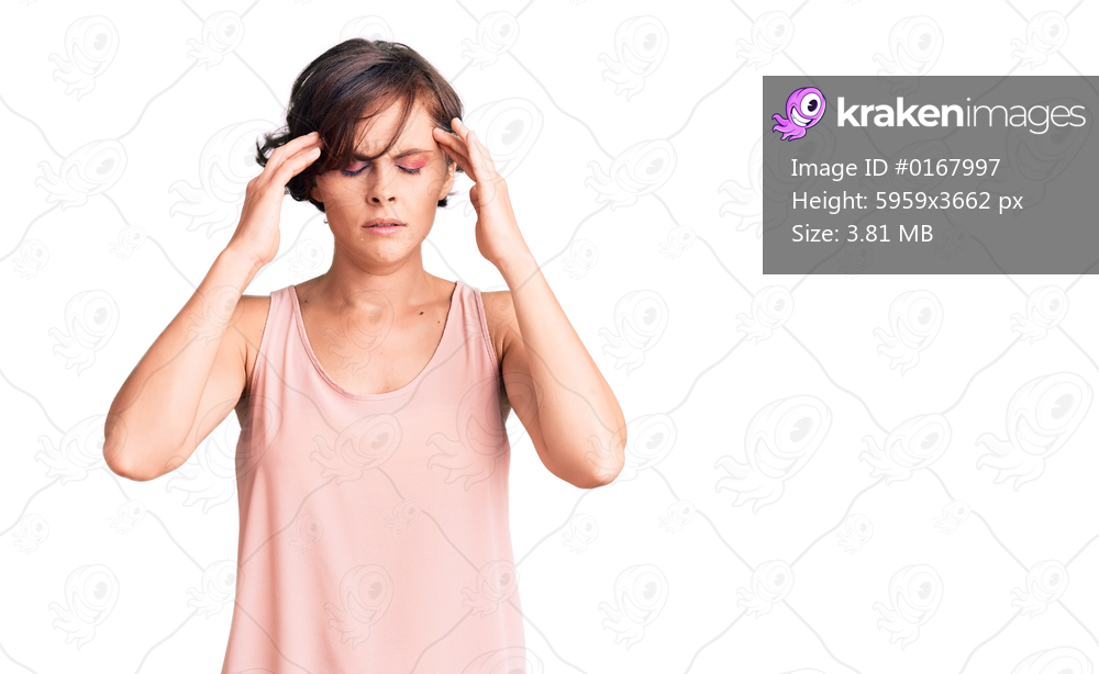 Beautiful young woman with short hair wearing casual style with sleeveless shirt with hand on head for pain in head because stress. suffering migraine. - Kraken Images