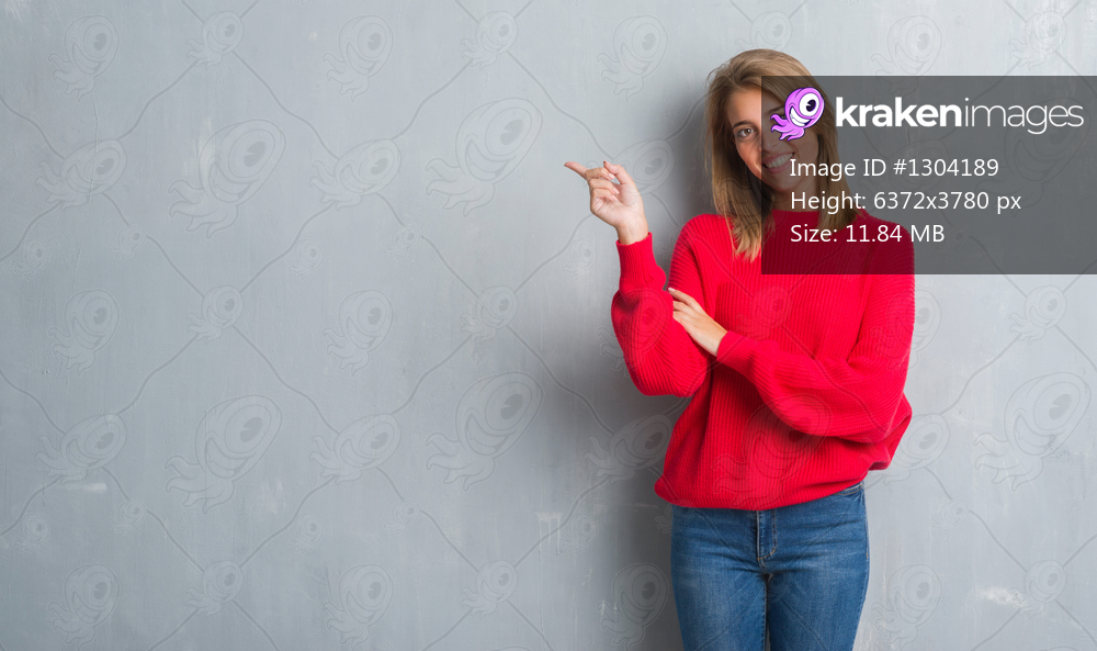 Beautiful young woman standing over grunge grey wall wearing winter sweater very happy pointing with hand and finger to the side