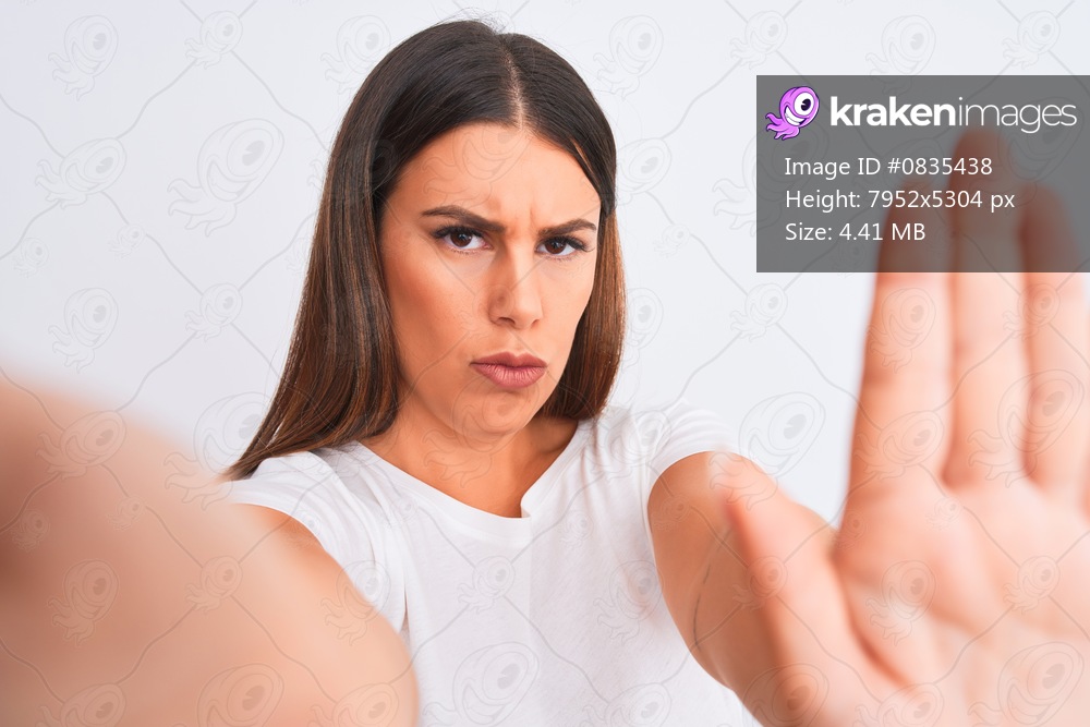 Beautiful young woman taking a selfie photo using smartphone over white background with open hand doing stop sign with serious and confident expression, defense gesture - Kraken Images