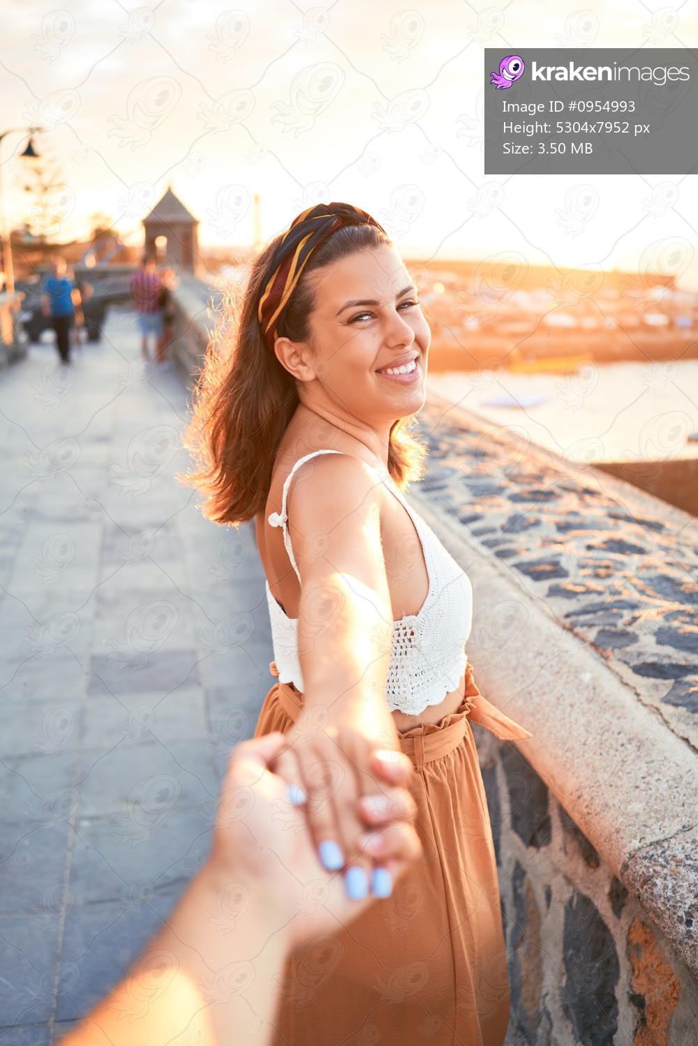 Beautiful young woman walking on beach promenade enjoying ocean view smiling happy on summer vacation holding hands with boyfriend