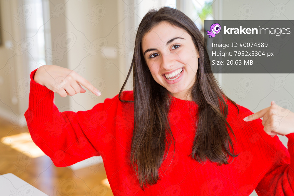 Beautiful young woman wearing casual red sweater looking confident with smile on face, pointing oneself with fingers proud and happy.