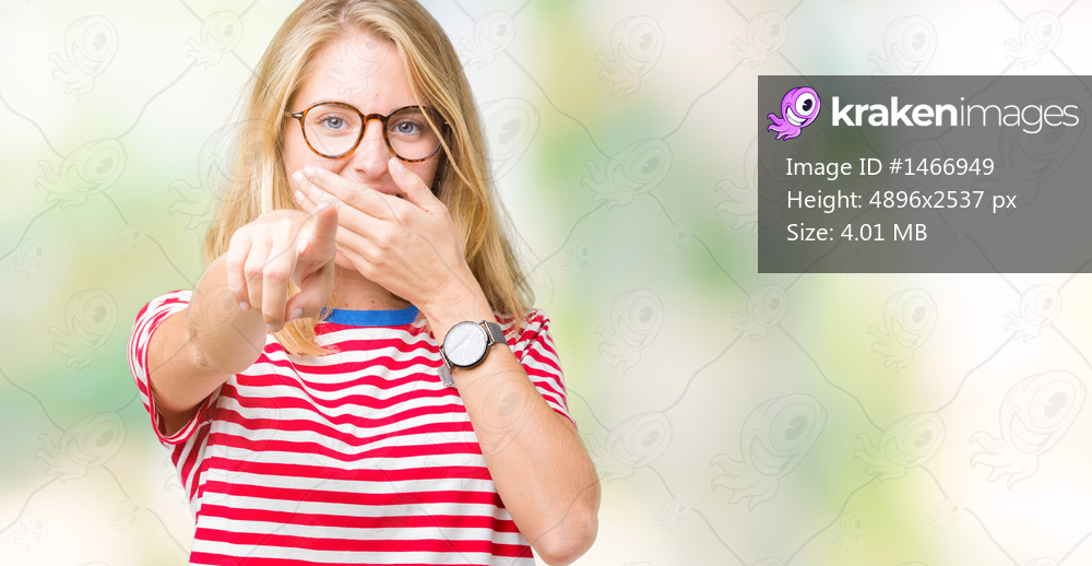 Beautiful young woman wearing glasses over isolated background Laughing of you, pointing to the camera with finger hand over mouth, shame expression