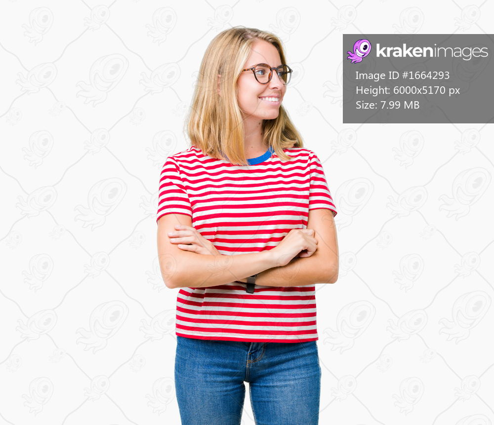 Beautiful young woman wearing glasses over isolated background smiling looking to the side with arms crossed convinced and confident