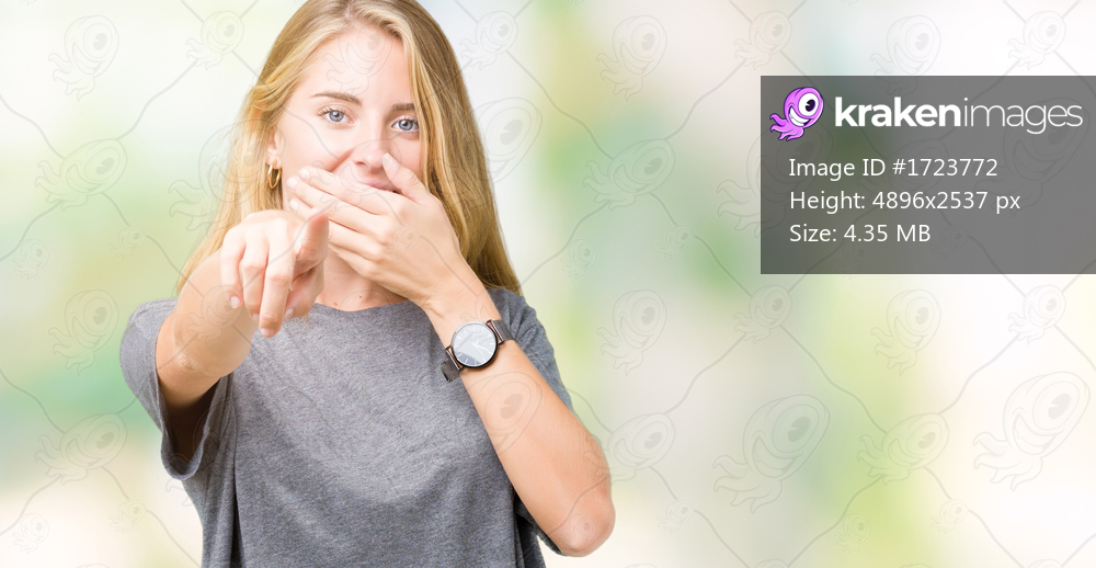 Beautiful young woman wearing oversize casual t-shirt over isolated background Laughing of you, pointing to the camera with finger hand over mouth, shame expression - Kraken Images