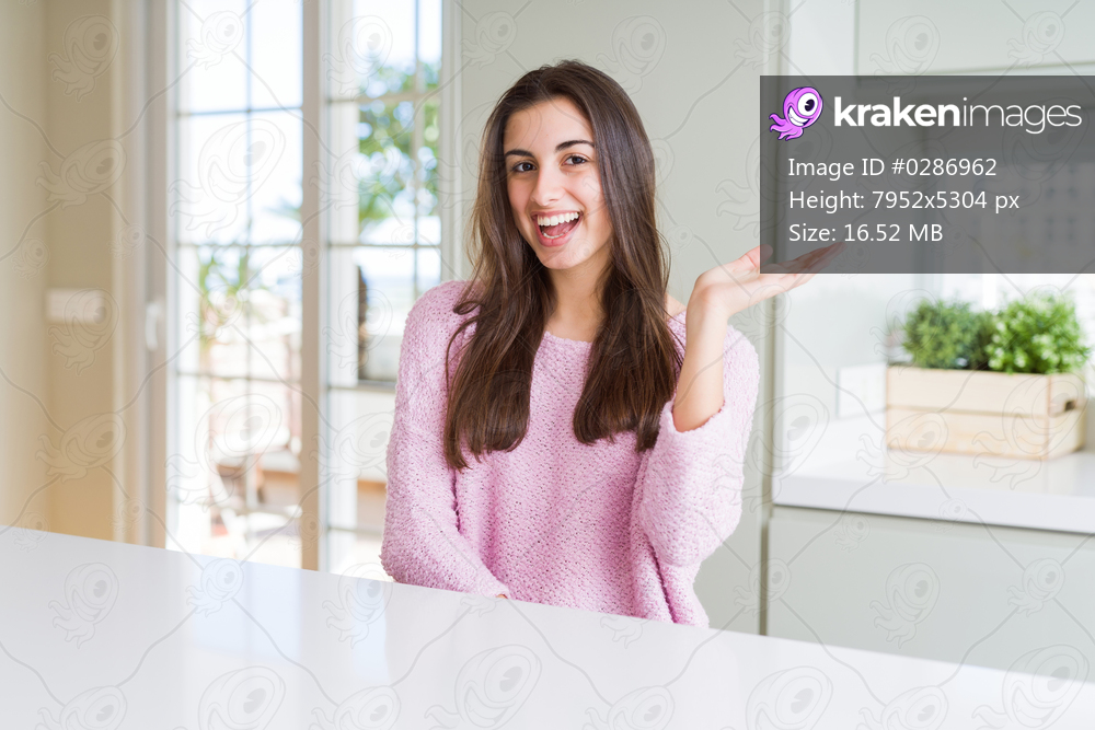 Beautiful young woman wearing pink sweater smiling cheerful presenting and pointing with palm of hand looking at the camera.