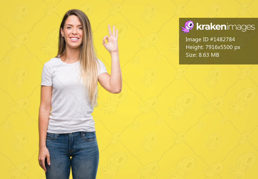 Beautiful young woman wearing t-shirt and jeans doing ok sign with fingers, excellent symbol