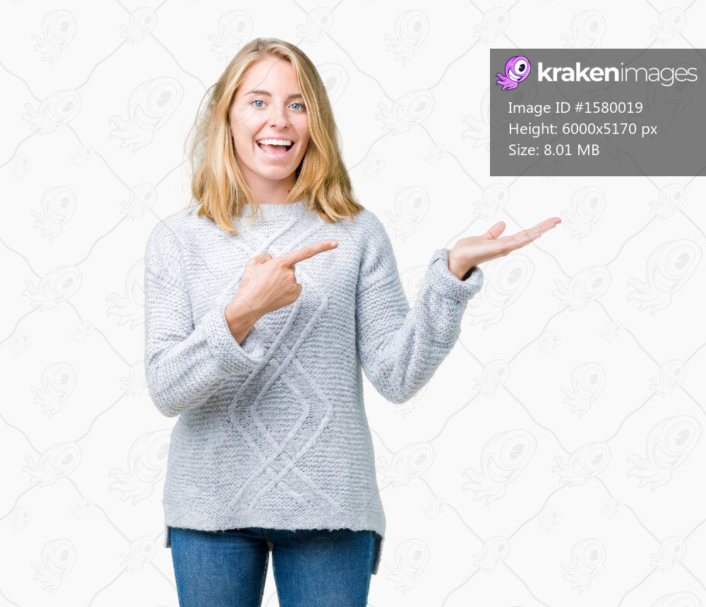 Beautiful young woman wearing winter sweater over isolated background amazed and smiling to the camera while presenting with hand and pointing with finger. - Kraken Images