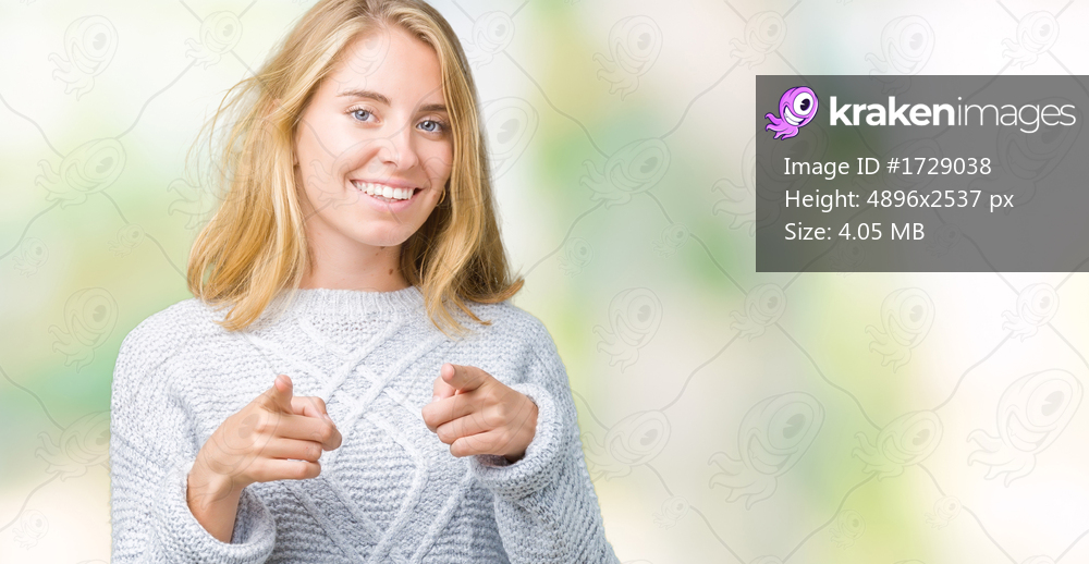 Beautiful young woman wearing winter sweater over isolated background pointing fingers to camera with happy and funny face. Good energy and vibes.