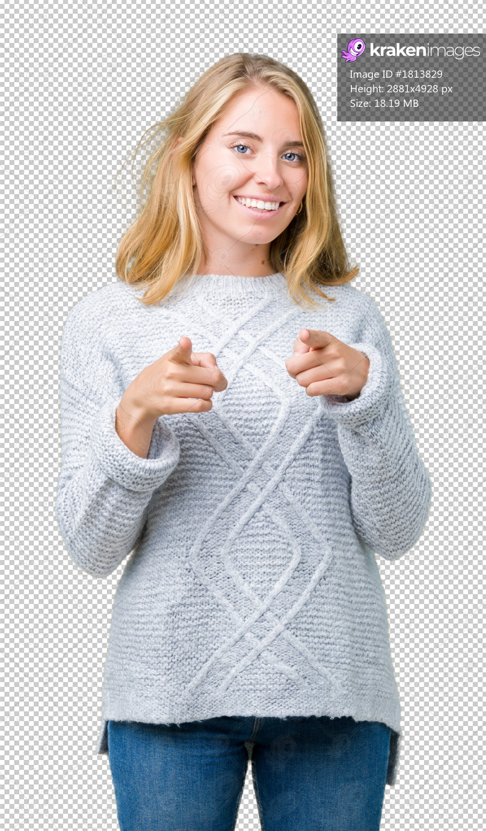 Beautiful young woman wearing winter sweater over isolated background pointing fingers to camera with happy and funny face. Good energy and vibes.
