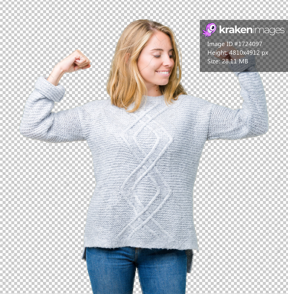 Beautiful young woman wearing winter sweater over isolated background showing arms muscles smiling proud. Fitness concept.