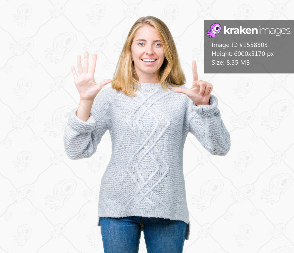 Beautiful young woman wearing winter sweater over isolated background showing and pointing up with fingers number seven while smiling confident and happy. - Kraken Images