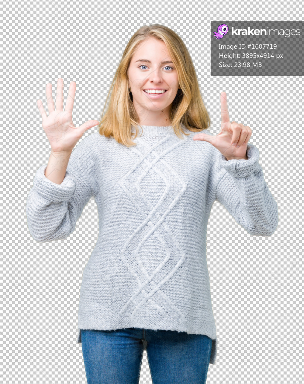 Beautiful young woman wearing winter sweater over isolated background showing and pointing up with fingers number seven while smiling confident and happy. - Kraken Images