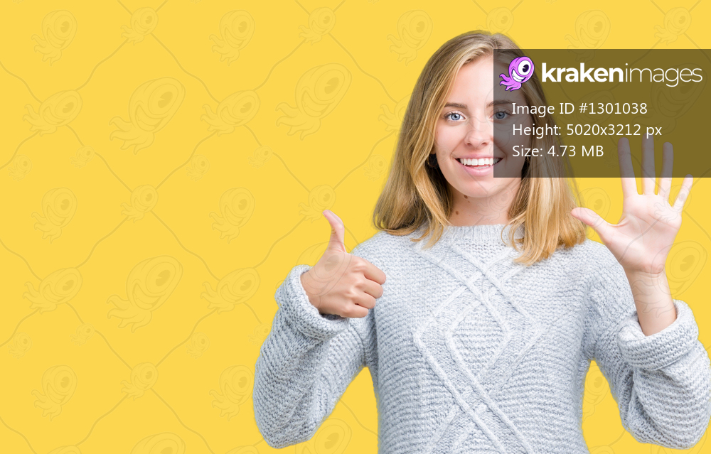 Beautiful young woman wearing winter sweater over isolated background showing and pointing up with fingers number six while smiling confident and happy. - Kraken Images