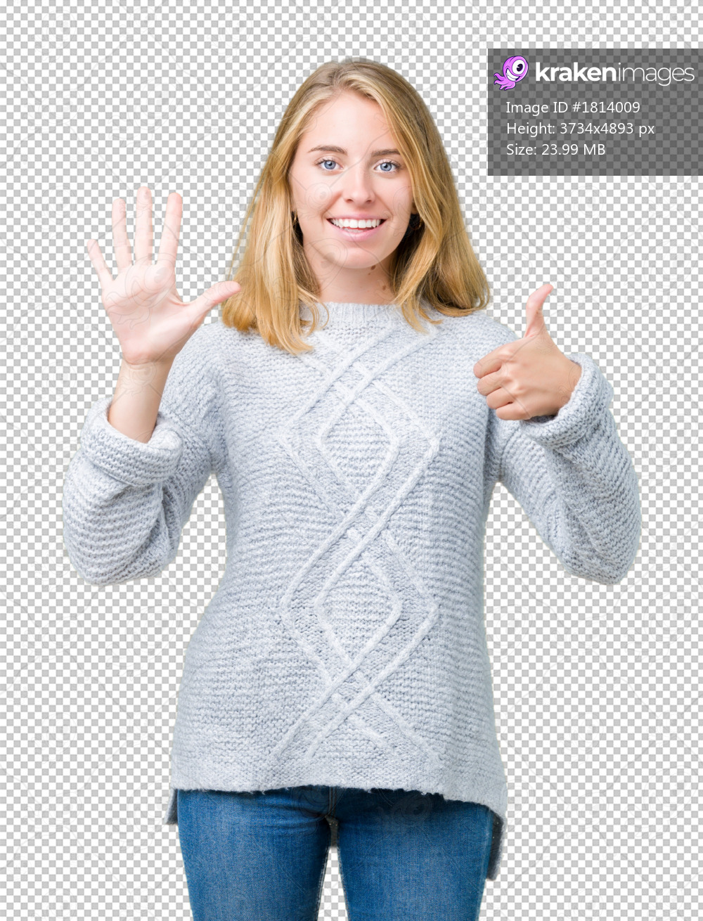 Beautiful young woman wearing winter sweater over isolated background showing and pointing up with fingers number six while smiling confident and happy. - Kraken Images