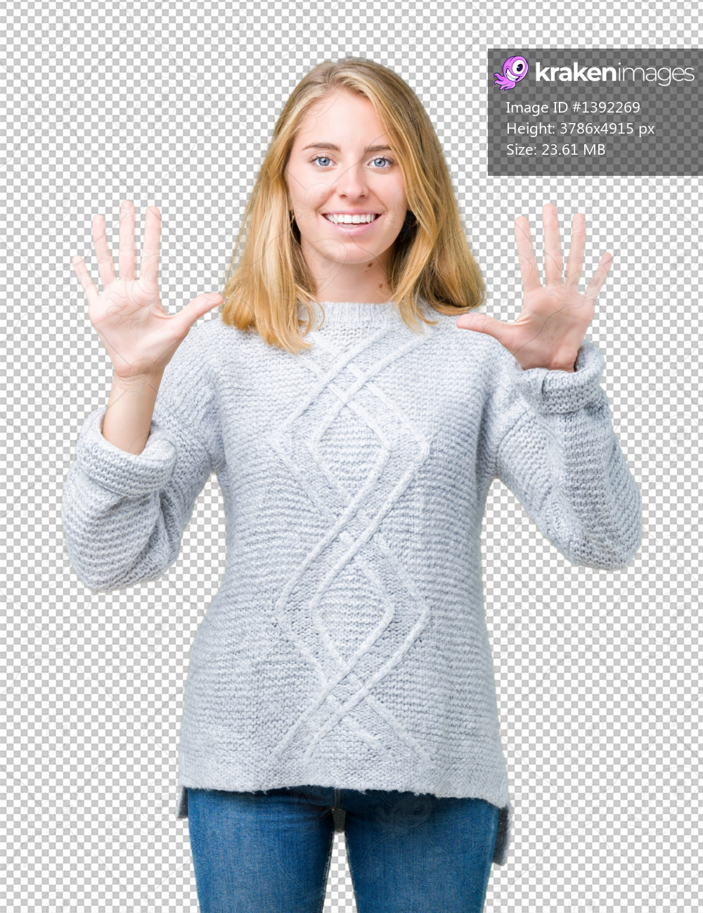 Beautiful young woman wearing winter sweater over isolated background showing and pointing up with fingers number ten while smiling confident and happy. - Kraken Images