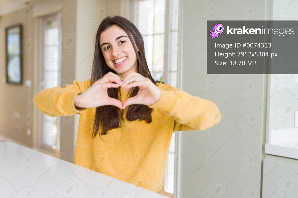 Beautiful young woman wearing yellow sweater smiling in love showing heart symbol and shape with hands. Romantic concept.