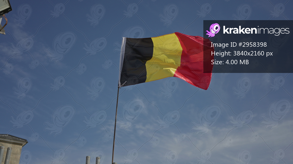 Belgian tricolor flag waves from a slim metal pole mounted beside a stone building roofline against a clear blue sky; national pride.