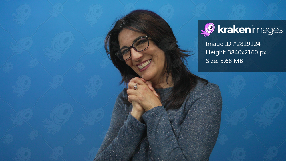 Bespectacled hispanic middle aged woman smiling with clasped hands in blue studio; gratitude sincerity.