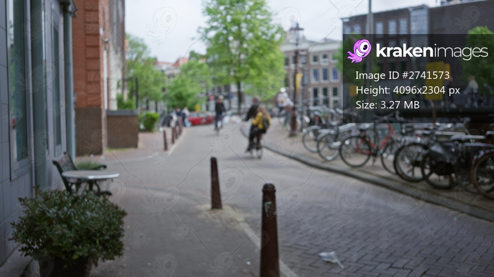 Bicycles lining an amsterdam street with blurred people and green trees highlighting a busy urban day in the netherlands, capturing motion and everyday life. - Kraken Images