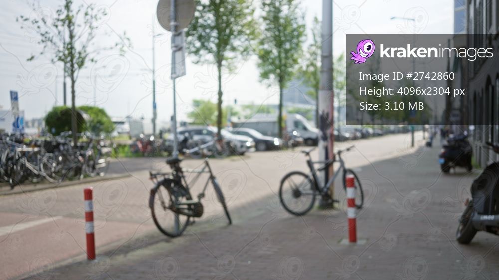 Bicycles parked along a defocused european city street showcasing an urban outdoor scene with a bokeh effect, capturing cars, trees, and a clear sky in the blurred background. - Kraken Images